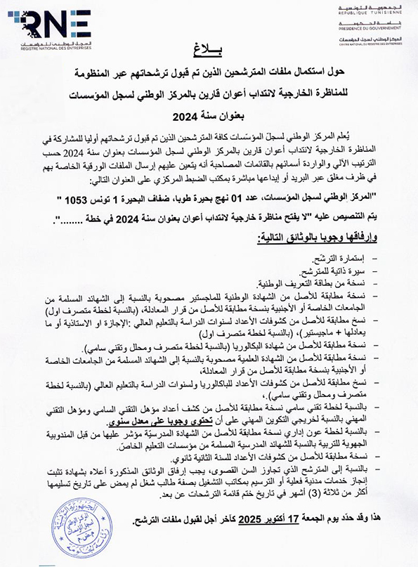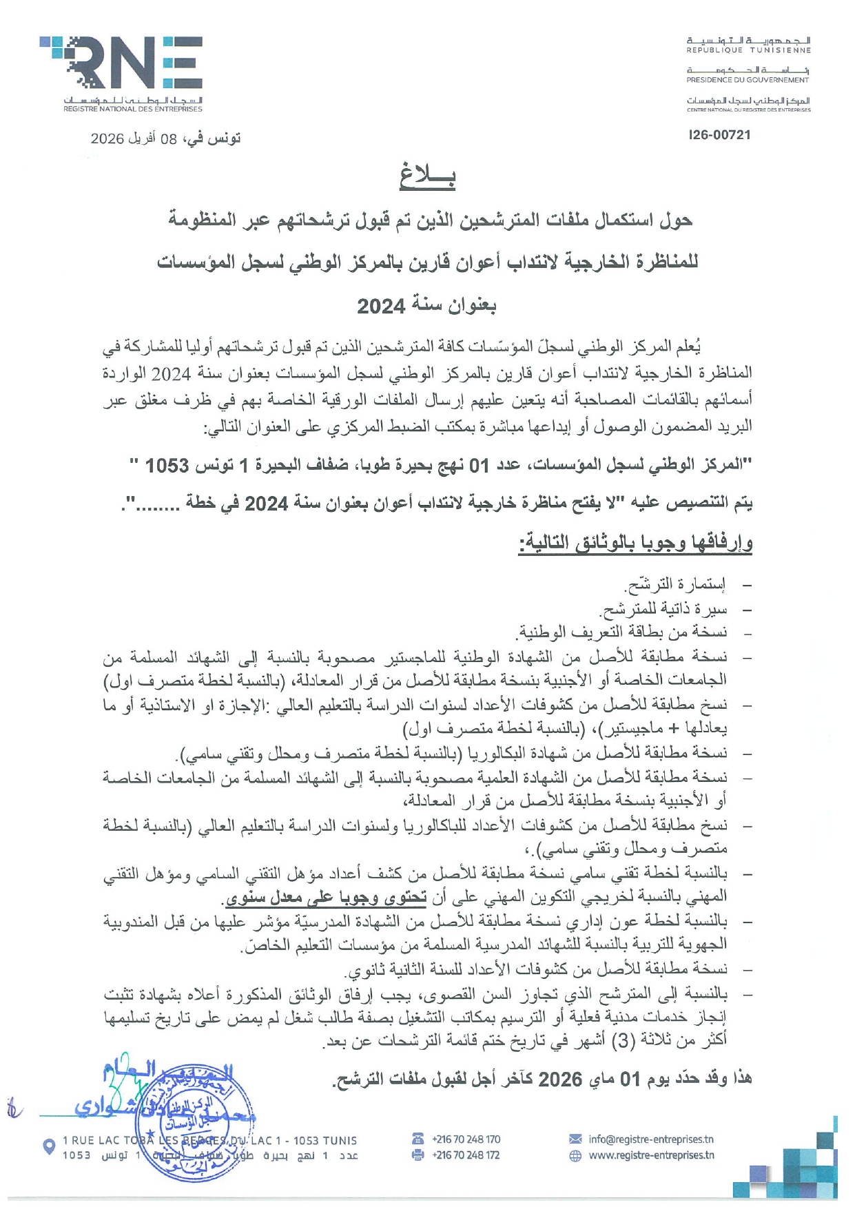 بلاغ حول إستكمال ملفات المترشحين الذي تم قبول ترشحاتهم عبر المنظومة للمناظرة الخارجية لإنتداب أعوان قارين بالمركز الوطني لسجل المؤسسات بعنوان سنة 2024