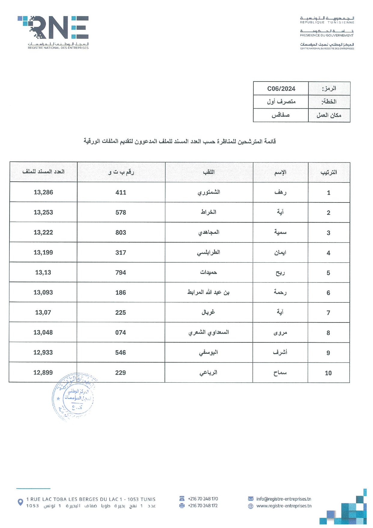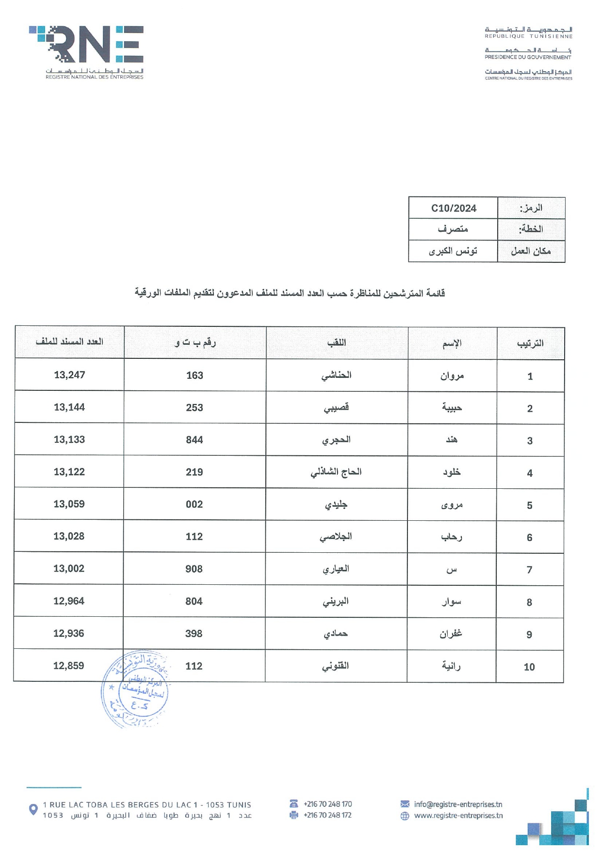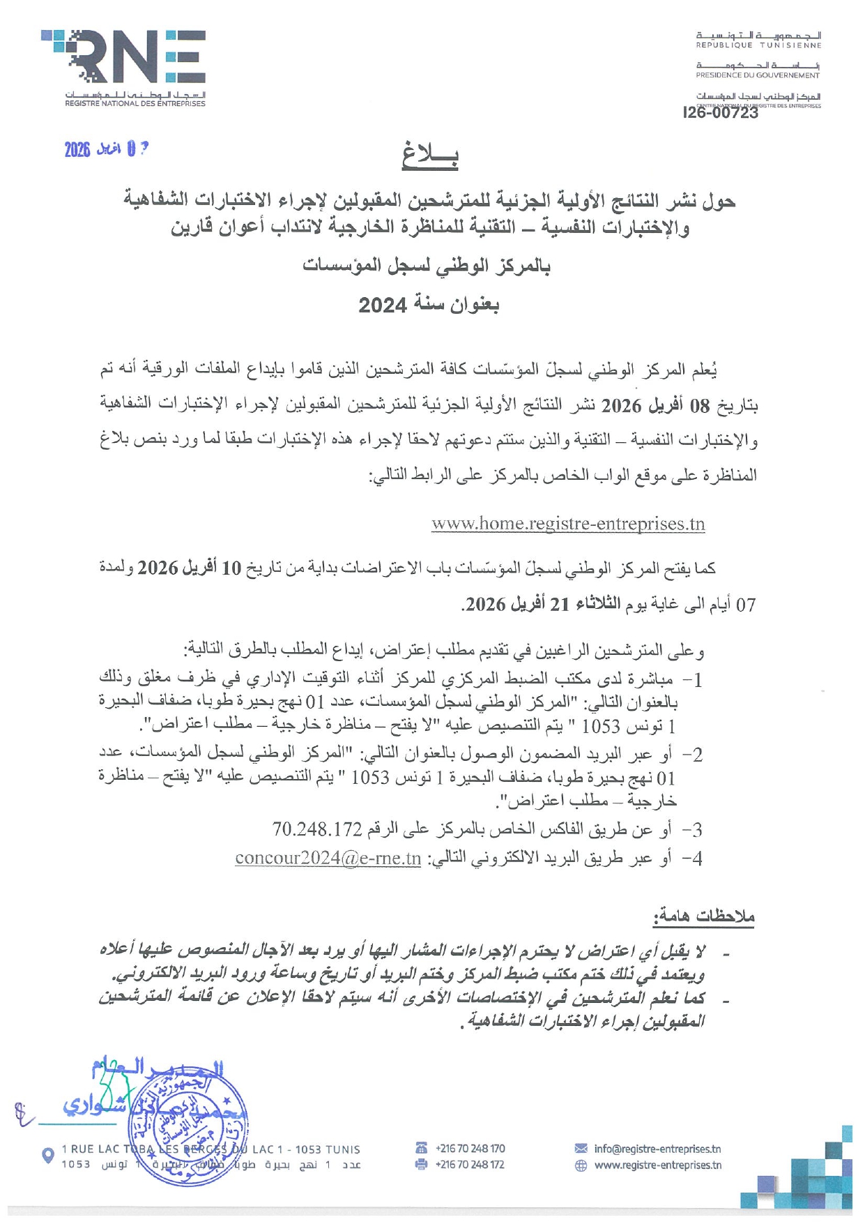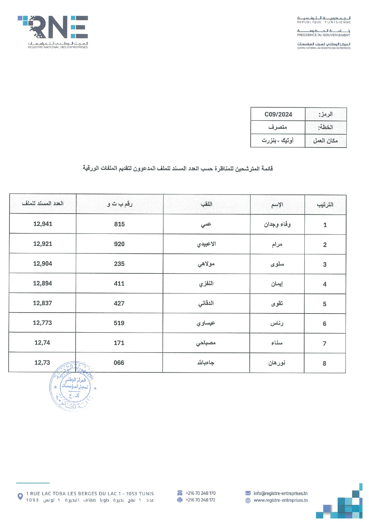 نتائج الترتيب الآلي للترشحات عن بعد للمناظرة الخارجية لإنتداب أعوان قارين بالمركز الوطني لسجل المؤسسات بعنوان سنة 2024