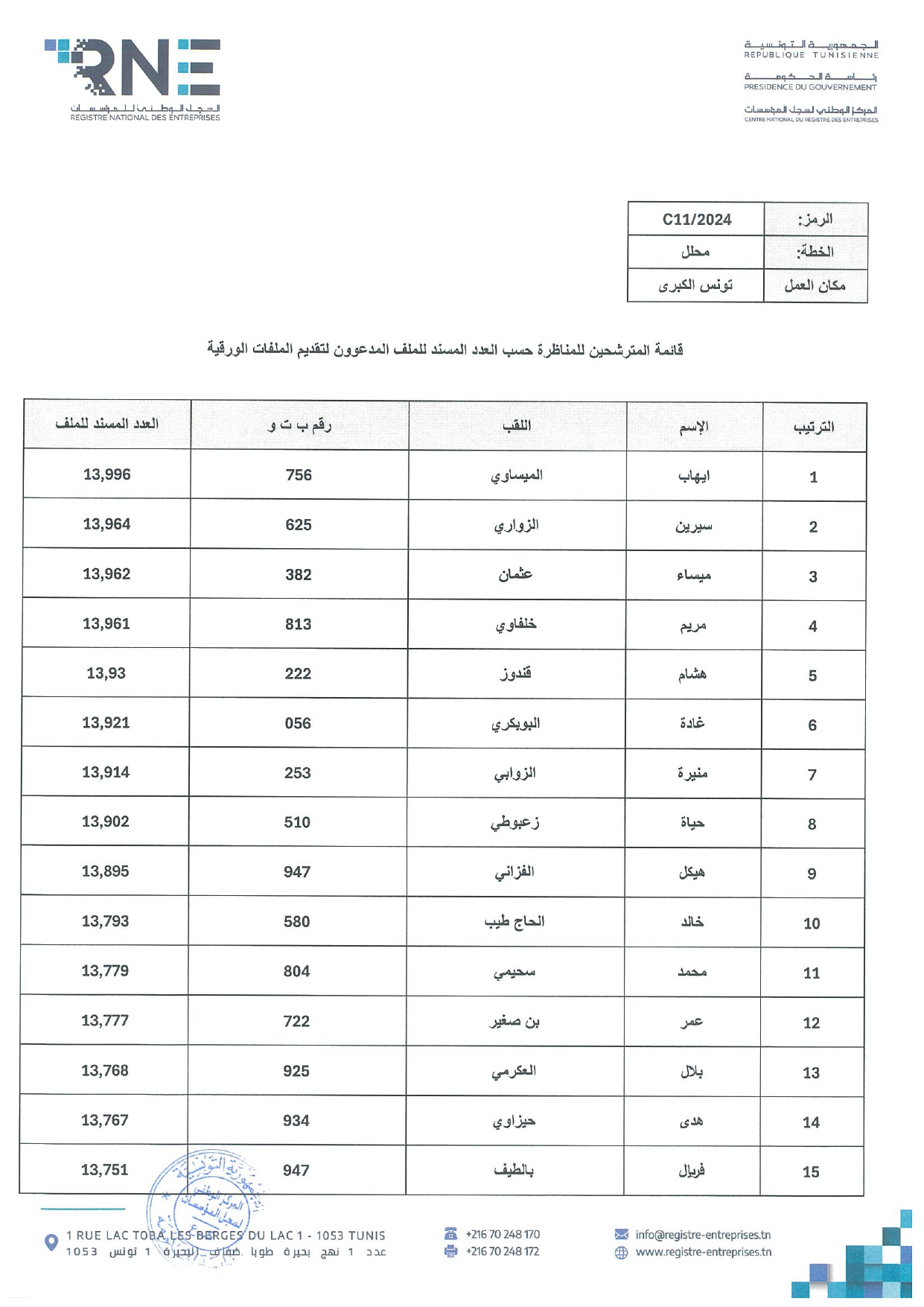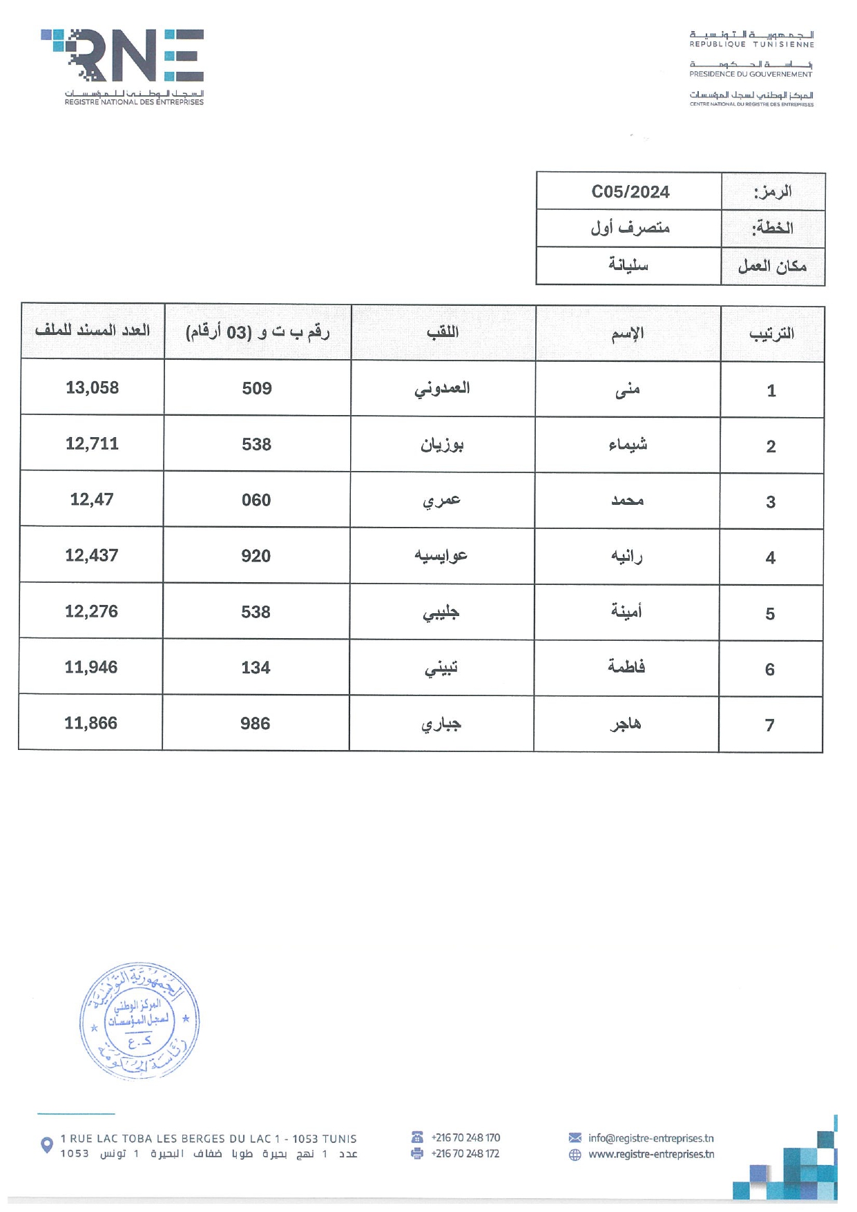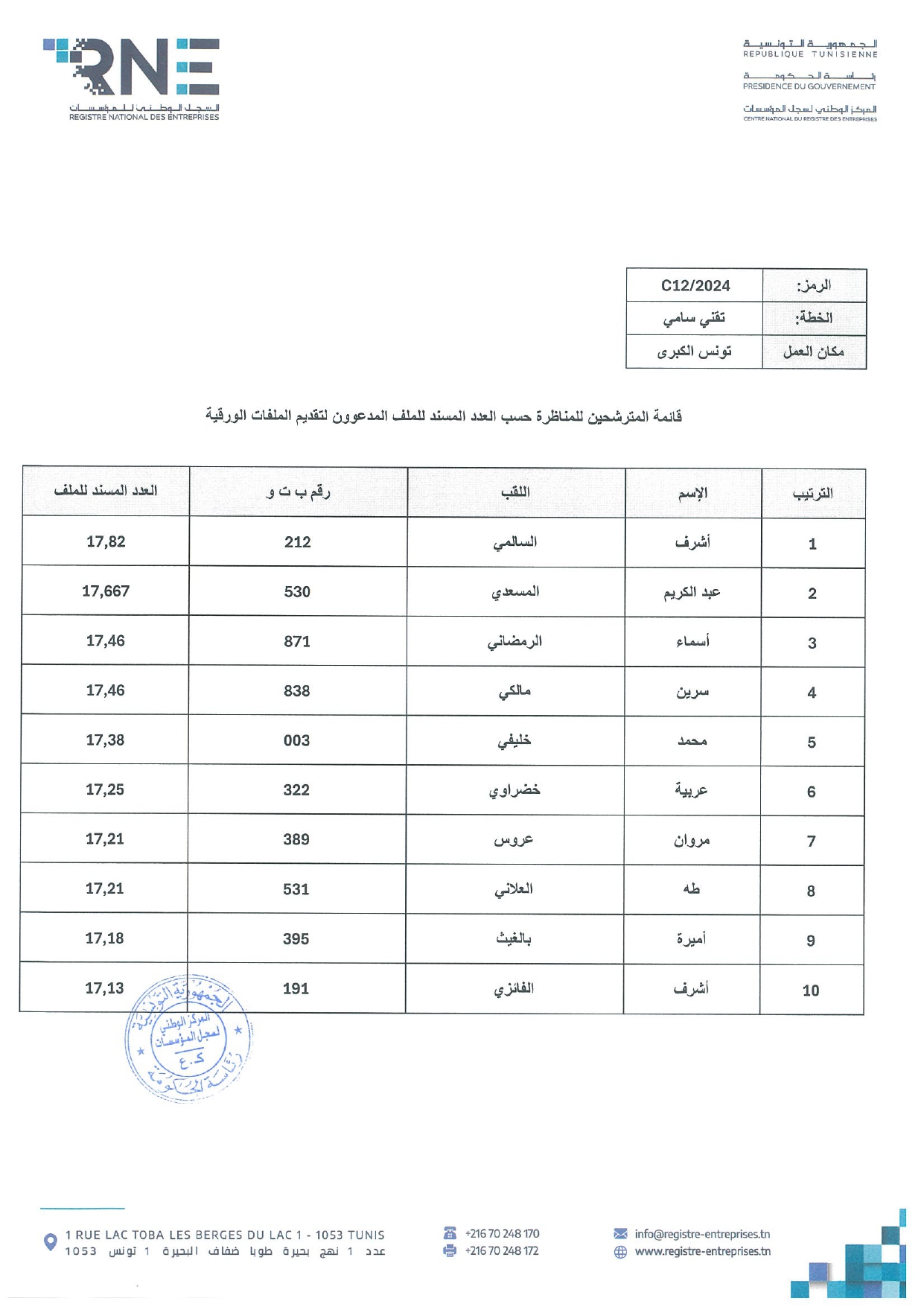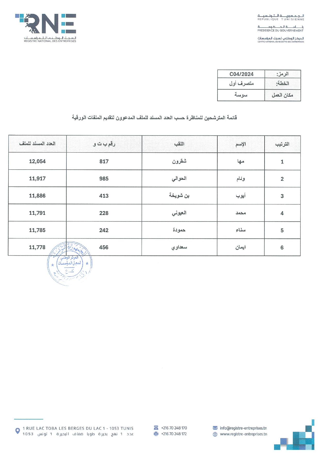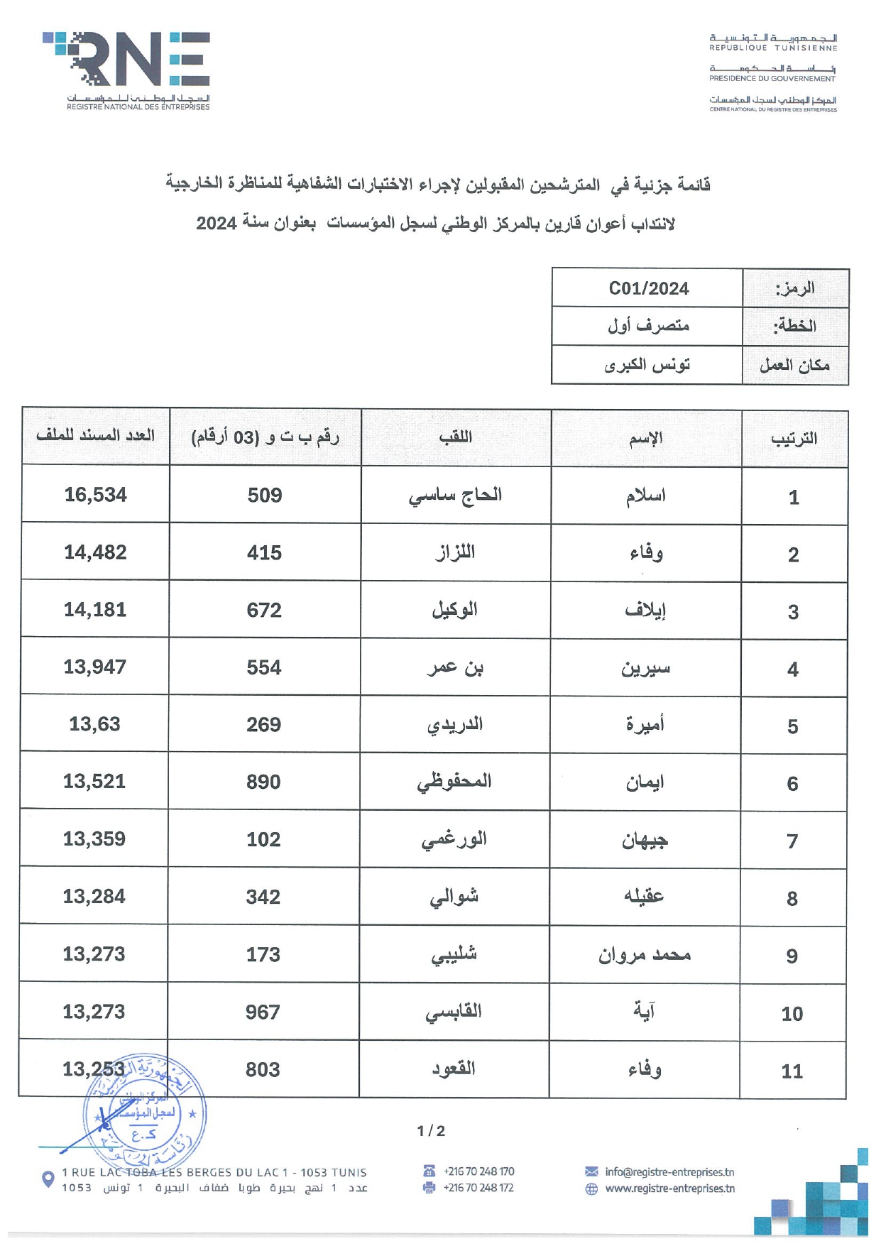 نتائج الترتيب الآلي للترشحات عن بعد للمناظرة الخارجية لإنتداب أعوان قارين بالمركز الوطني لسجل المؤسسات بعنوان سنة 2024