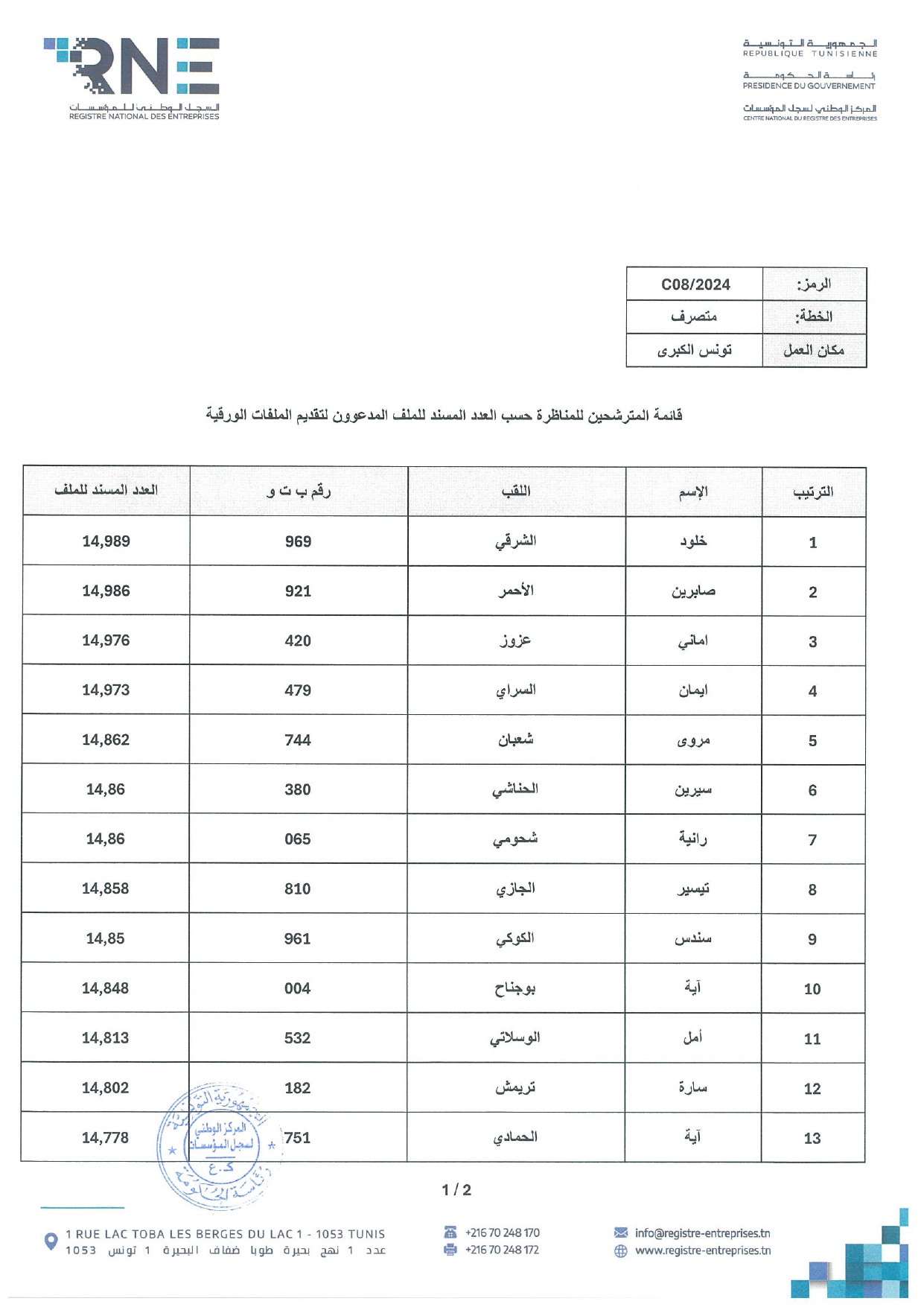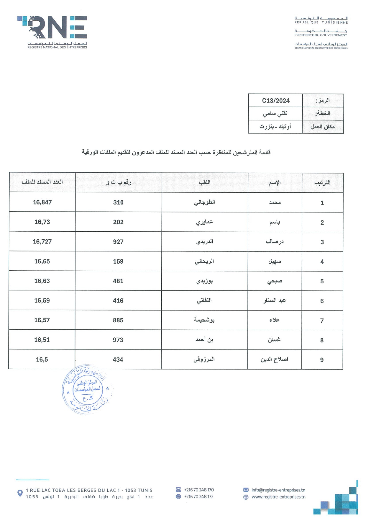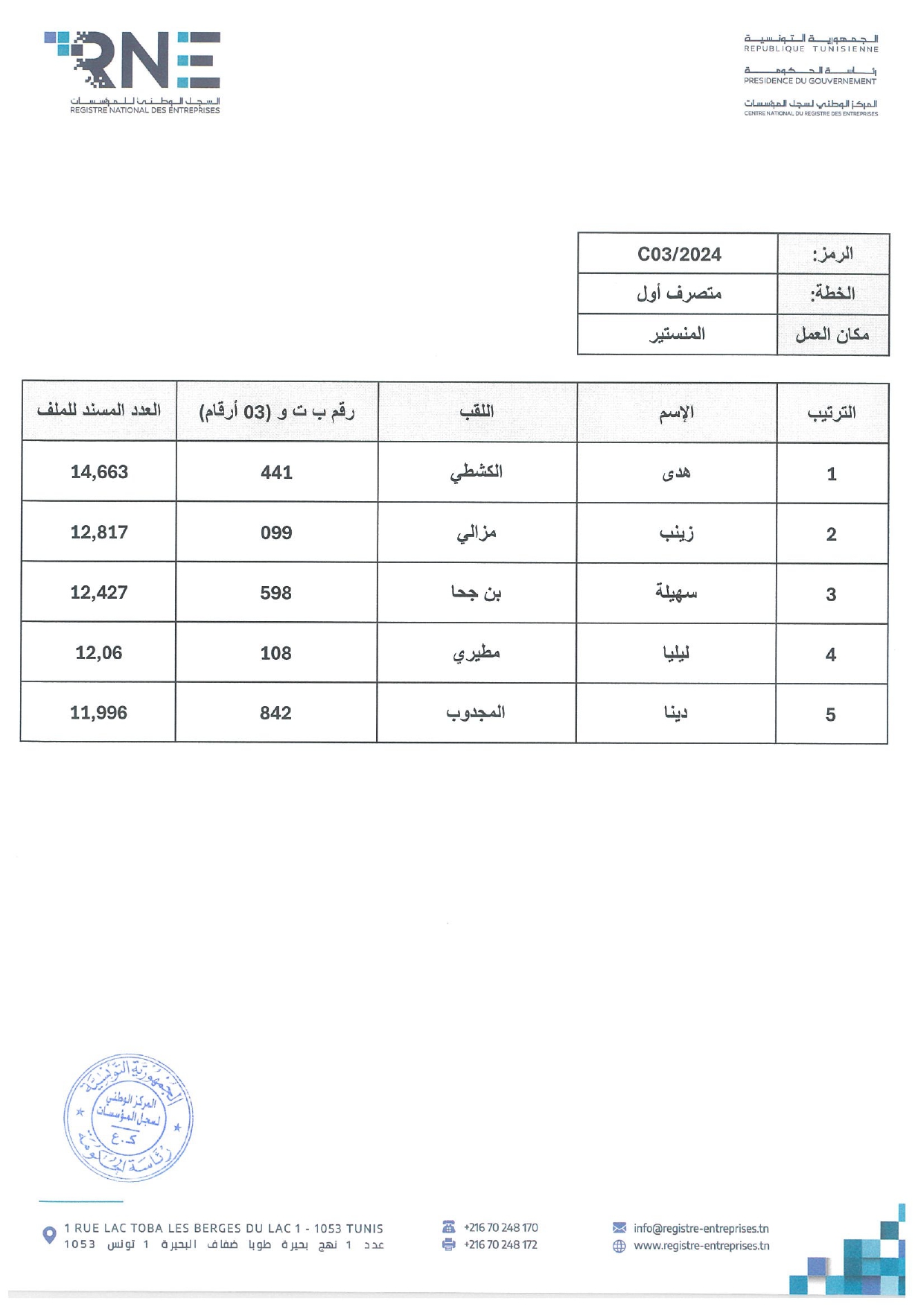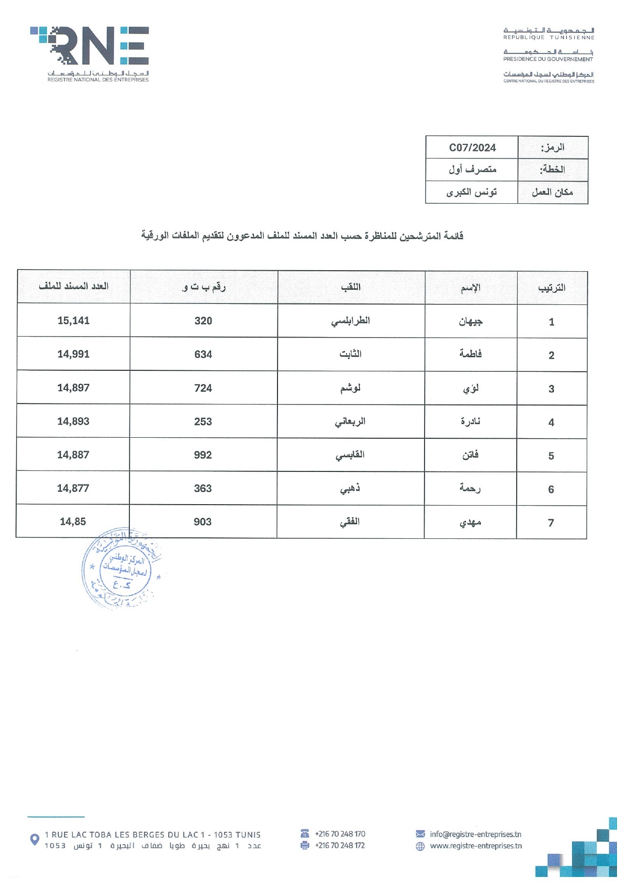 نتائج الترتيب الآلي للترشحات عن بعد للمناظرة الخارجية لإنتداب أعوان قارين بالمركز الوطني لسجل المؤسسات بعنوان سنة 2024
